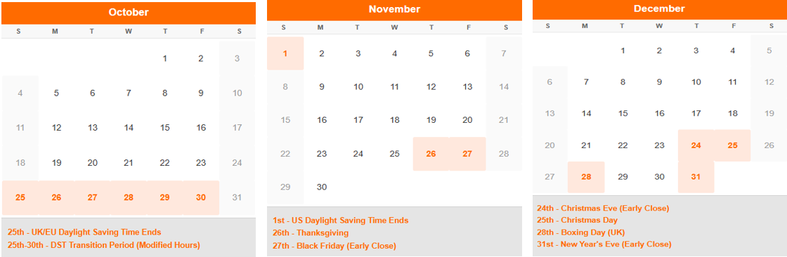 All FX markets open at 9pm on Sunday 25 October and close at 9pm on Friday 30 October | |