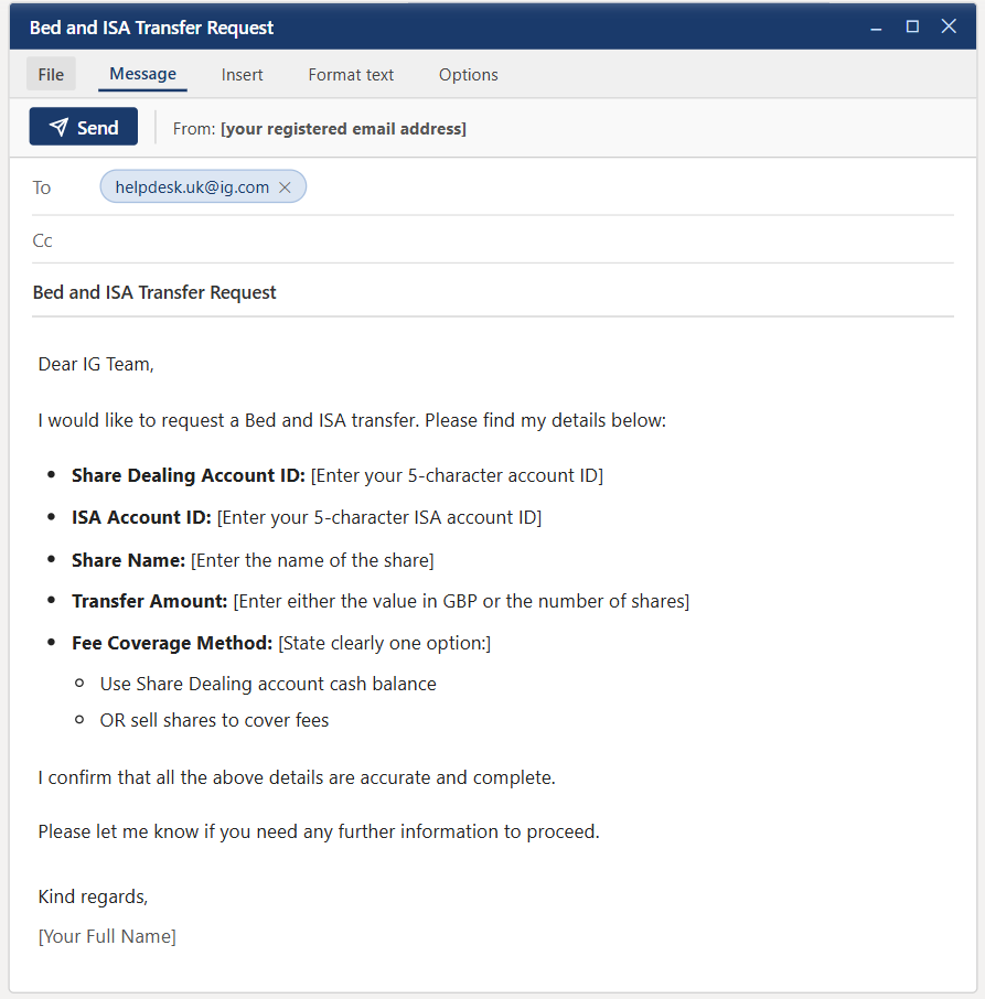 Send an email to helpdesk.uk@ig.com from your registered email address with the subject line Bed and ISA Transfer Request. |